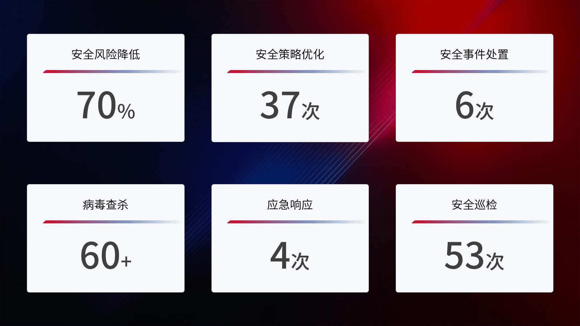 提供全面的安全事件报告体系,,,包括处置报告、、周报、、、、季度和年度总结,,结合持续监控,,,帮助客户深入了解网络安全状况。。