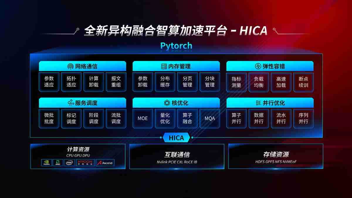 通过自研的服务层、、中间适配层、、以及调度编排算法,,,采用数据并行、、、、模型并行等多种并行方式,,,,把并行计算任务进行有效的分解,,,使其分别由相应的软件栈和算力资源来承接。。。。当GPU资源变化,,HICA可以实时动态调度计算子任务并调整模型拓扑和架构,,,,以充分聚合各种算力资源。。。